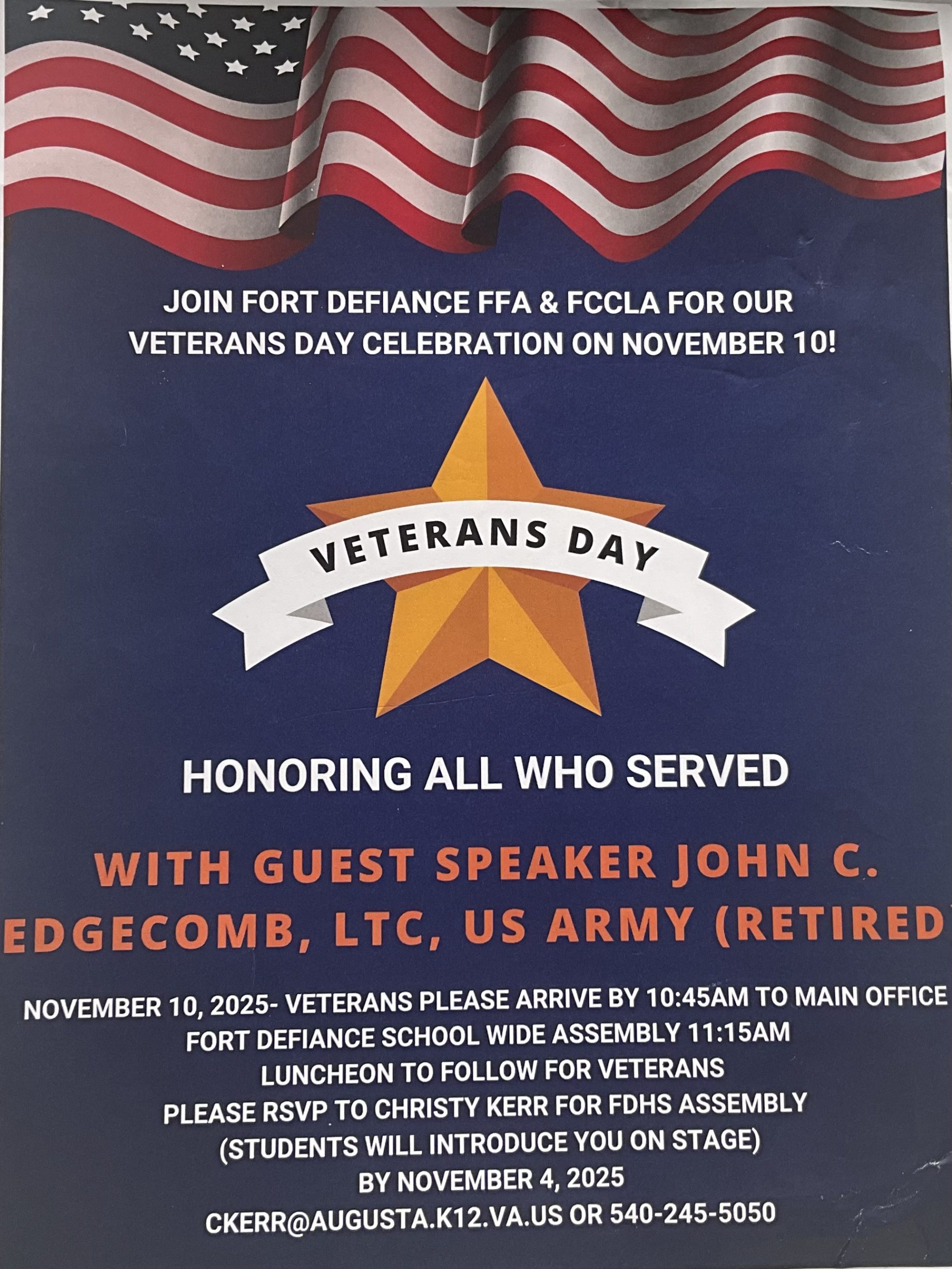 Join Fort Defiance FFA & FCCLA for a Veterans Day celebration. Guest Speaker John C. Edgecomb, LTC, US Army (Ret.). Veterans should arrive by 10:45 at Fort Defiance High School main office. School wide assembly at 11:15. Lunch follows the assembly. RSVP to Christy Kerr by November 4, 2025. Ckerr@augusta.k12.va.us or 540-245-5050